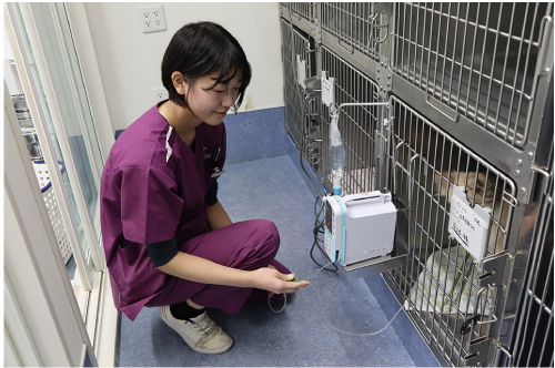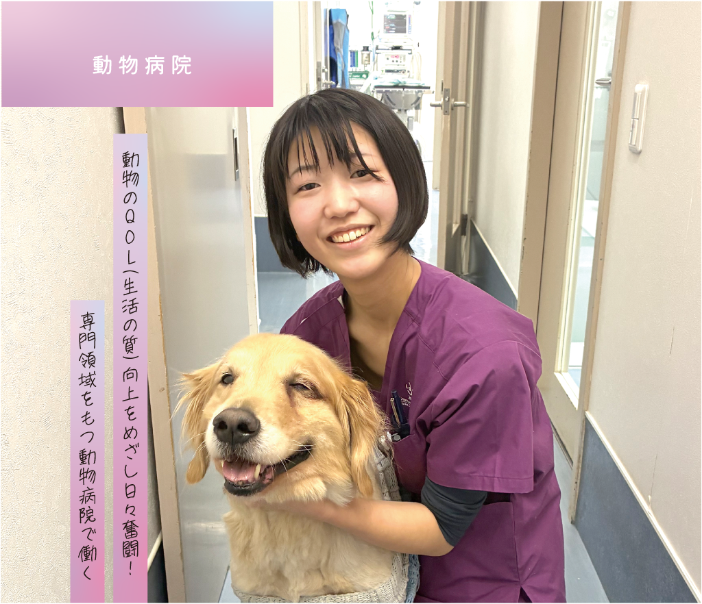 専門職短期大学や現場での経験・学びを活かせた時、通院している飼い主様と親しくなり寄り添える存在になっていると実感した時にやりがいを感じます。生と死が交錯する場なので、自分の動き次第で動物の生死が左右されることがあり、辛いと感じることもあります。しかし処置に携わった子が元気になった姿を見たり、自分の仕事が評価された時は嬉しいですし、あらゆる経験を糧に強くなっていきたいと思っています。