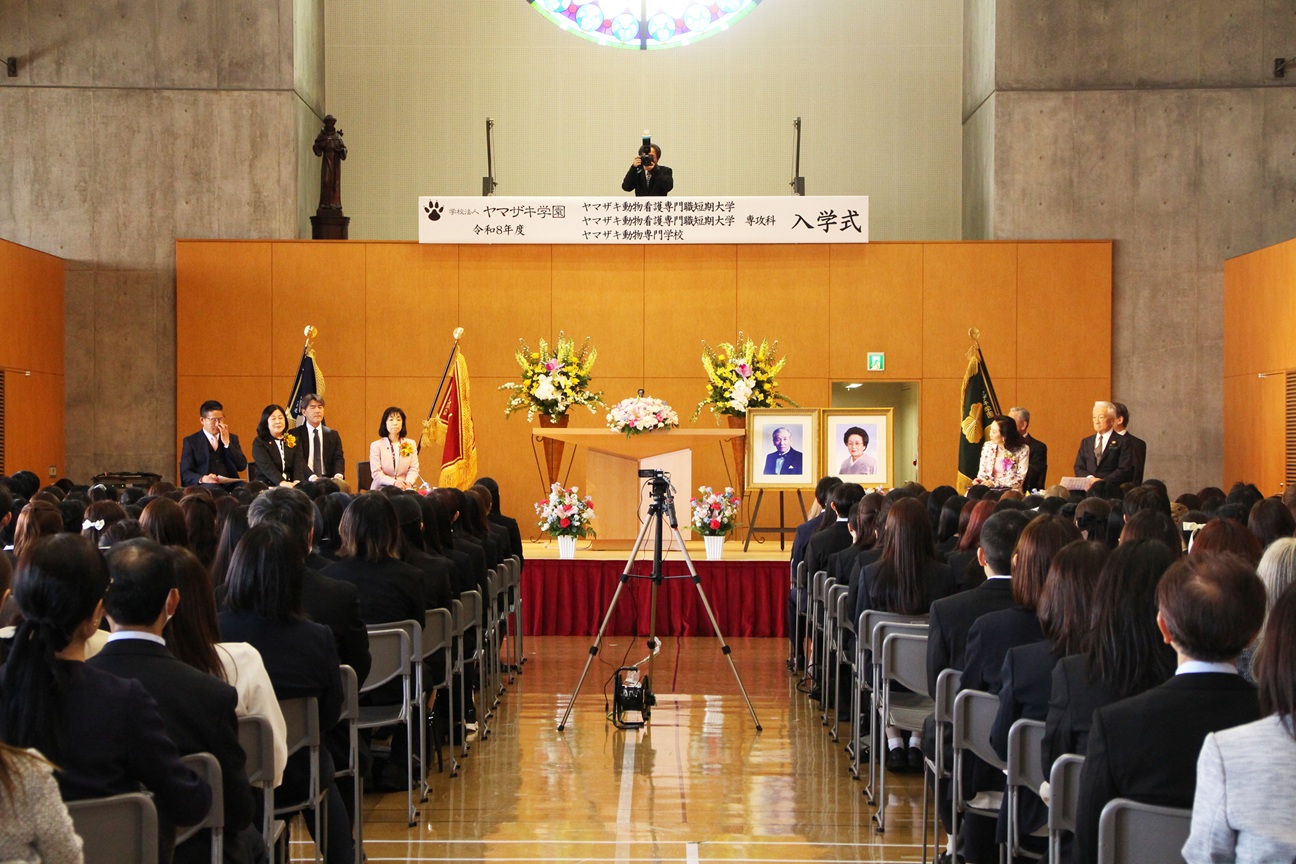 令和8年度入学式を挙行しました! 2026(令和8)年4月3日(金)南大沢キャンパスにて、ヤマザキ動物看護専門職短期大学 動物トータルケア学科、専攻科 動物トータルケア看護学専攻およびヤマザキ動物専門学校 愛玩動物看護学科の入学式が挙行され、 専門職短期大学は91名の学科生と2名の専攻科を迎え入れました。 いよいよ新たな学生生活がスタートします。 新入生の皆さん、夢の実現に向けてぜひ頑張ってください。