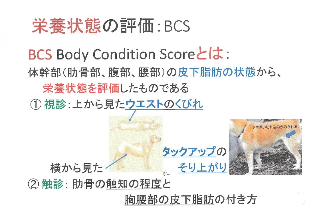 *ここでは標準をBCS3:体脂肪率15~25%として、BCS:Body Condition Score. 1は削痩、2.は痩せ型、4.は過体重、5.は肥満です。