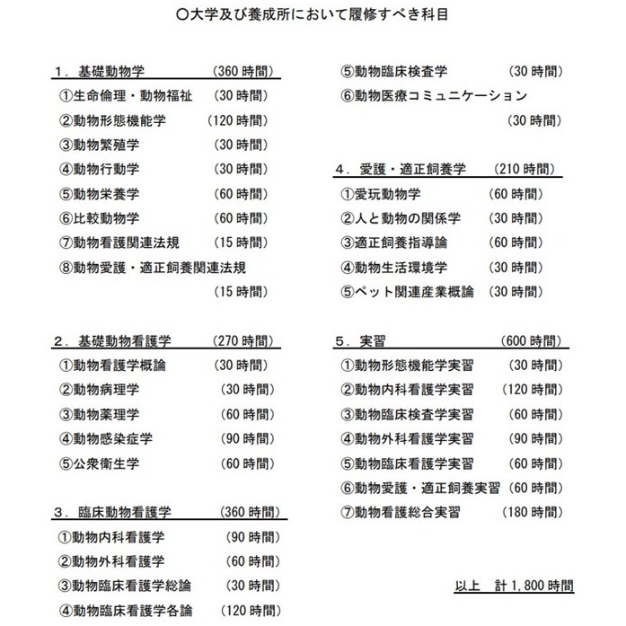 愛玩動物看護師は農林水産省と環境省の両省が管轄する珍しい国家資格です。国家試験を受けるための科目は31ありますが(図1参照)、看護系の科目と愛護・適正飼養学系の科目に分かれているのが見てとれます。本学では卒業要件(卒業するために必要な条件)の一つが国家試験受験資格取得となっていますので、卒業ができるということは国家試験を受けられるということになります。