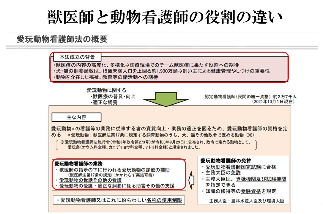 愛玩動物看護師の英語名は“Veterinary Nurses for Companion Animals”となり、コンパニオンアニマル(伴侶動物・愛玩動物)のための動物看護師となります。海外では産業動物や動物園動物を対象とする動物看護師もいますが、今回の日本の動物看護師は家庭で人とともに暮らす動物が対象です。また、動物だけでなく飼い主である人に対する色々な役割もあります。