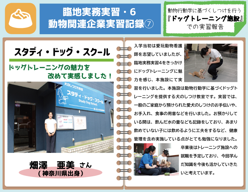 臨地実務実習・6 臨地実務実習6では、就職希望先を見据え将来企業での就職を希望する学生、動物関連企業で実習(8日間×2施設)を行います。 職業専門科目で学修した内容に加え、展開科目で産業と社会の繋がりを学修したことを通して、顧客のニーズを把握し、通常業務における顧客への対応を学学びます。 【10/15更新】